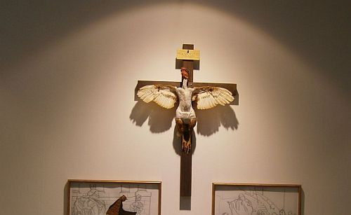 Nachsatz 26. September 2015: Das gekreuzigte Huhn von Deborah Sengl auf der Messe viennacontemporary - war auch schon 2013 in St Peter an der Sperr, Wienerneustadt, zu sehen.Giuseppe Nardi fand dafür die passenden Worte. Ich würde mir von Muslimen so einen Kommentar auf angebliche Mohammad-Beleidigungen wünschen!